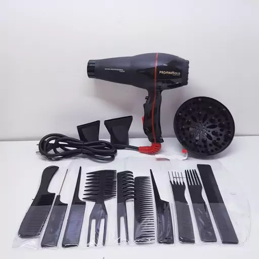 سشوار پرومکس گلد اصلی وات LUXE AIR 7 – 7000 حرفهای، همراه با 10 عدد شانه، 2 سری و دیسپانسر